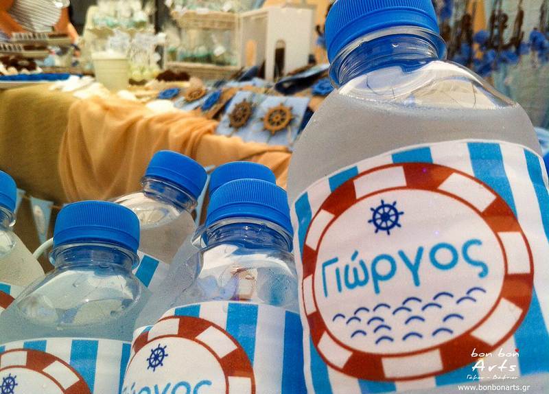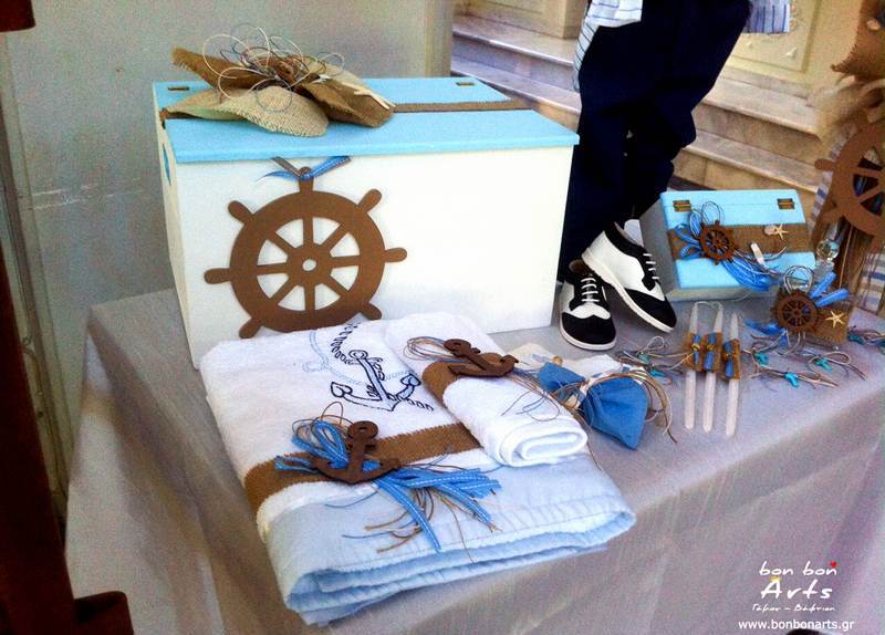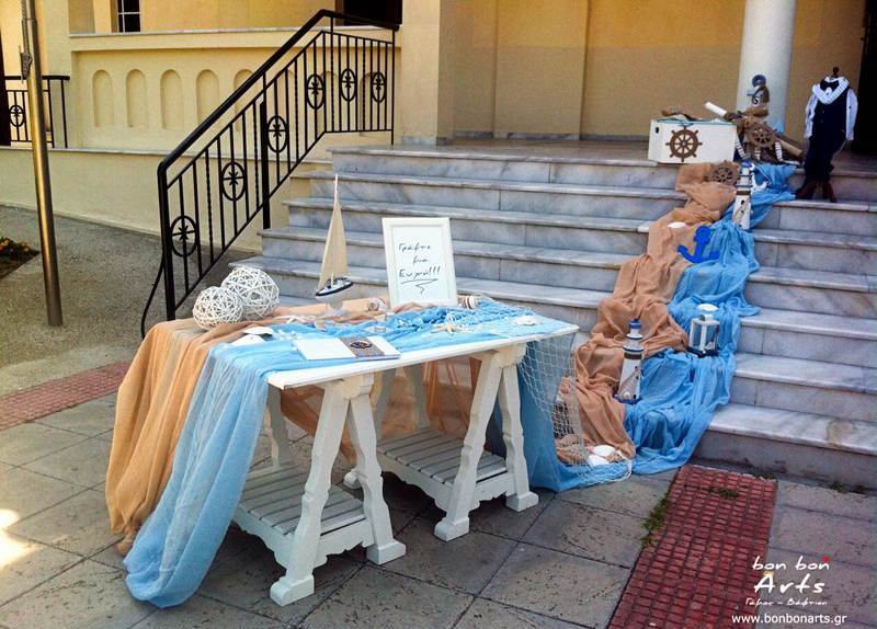 Τα σκαλοπάτια της εκκλησίας διακοσμήθηκαν με υφάσματα και ναυτικά διακοσμητικά, ενώ στο πιο χαμηλό σημείο στήθηκε το τραπέζι των ευχών, όπου όλοι χάρισαν την ευχή τους στο νεοφώτιστο και τα συγχαρητήρια στους γονείς του, γράφοντας στο χειροποίητο βιβλίο ευχών. Η λαμπάδα, το κουτί, όλα τα αξεσουάρ της βάπτισης και το ρούχο ήταν απόλυτα ενοποιημένα με το ύφος της βάπτισης. Οι μπομπονιέρες, μια ξύλινη κρεμαστή άγκυρα για τους μικρούς φίλους του Γιώργου και μια δετή μπομπονιέρα με γάζα και ξύλινο τιμόνι για τους μεγάλους.
