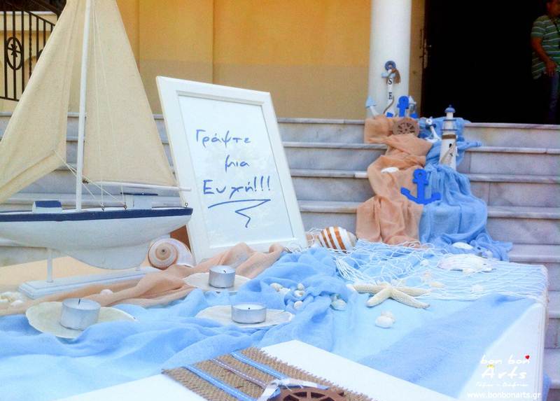 Τα σκαλοπάτια της εκκλησίας διακοσμήθηκαν με υφάσματα και ναυτικά διακοσμητικά, ενώ στο πιο χαμηλό σημείο στήθηκε το τραπέζι των ευχών, όπου όλοι χάρισαν την ευχή τους στο νεοφώτιστο και τα συγχαρητήρια στους γονείς του, γράφοντας στο χειροποίητο βιβλίο ευχών.  Η λαμπάδα, το κουτί, όλα τα αξεσουάρ της βάπτισης και το ρούχο ήταν απόλυτα ενοποιημένα με το ύφος της βάπτισης.  Οι μπομπονιέρες, μια ξύλινη κρεμαστή άγκυρα για τους μικρούς φίλους του Γιώργου και μια δετή μπομπονιέρα με γάζα και ξύλινο τιμόνι  για τους μεγάλους.