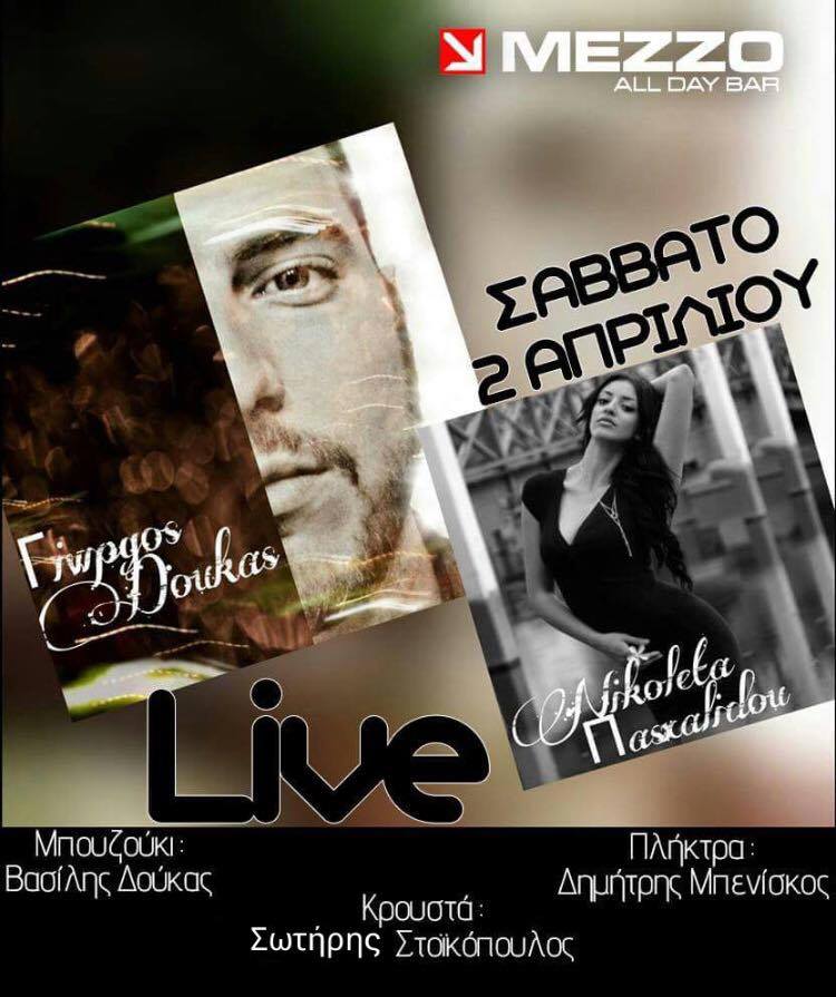 Απόψε Σάββατο 2 Απριλίου ο Γιώργος Δούκας και η Νικολέτα Πασχαλίδου σας περιμένουν σε ένα δυνατό live στο ΜΕΖΖΟ στον πεζόδρομο Αλεξάνδρειας!