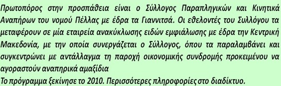 - ΣΥΛΛΟΓΟΣ ΠΑΡΑΠΛΗΓΙΚΩΝ ΚΑΙ ΚΙΝΗΤΙΚΑ ΑΝΑΠΗΡΩΝ Ν. ΠΕΛΛΑΣ στα Γιαννιτσά (Κολοκοτρώνη 10, 58100 τηλ. 23820 81308).