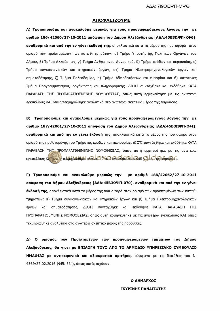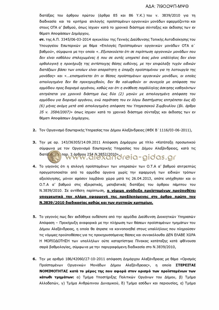 Είχαμε γράψει προ ημερών σχετικά με την απόφαση του δημάρχου Αλεξάνδρειας Παναγιώτη Γκυρίνη η οποία ακύρωνε απόφαση του 2011 του δήμου Αλεξάνδρειας με την οποία συγκεκριμένοι υπάλληλοι είχαν οριστεί ως προϊστάμενοι τμημάτων του δήμου (κλικ ΕΔΩ).