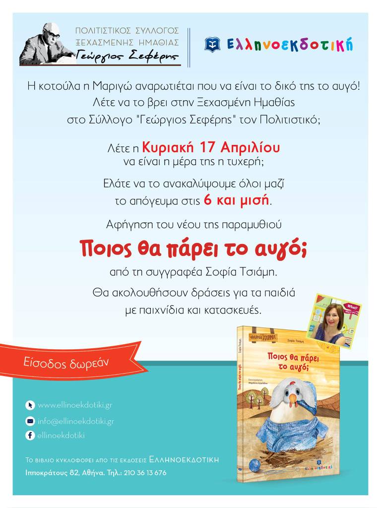 Την Κυριακή 17 Απριλίου η συγγραφέας Σοφία Τσιάμη θα παρουσιάσει το νέο της βιβλίο με τίτλο “Ποιος θα πάρει το αυγό;” στον Πολιτιστικό Σύλλογος Ξεχασμένης Γεώργιος Σεφέρης.