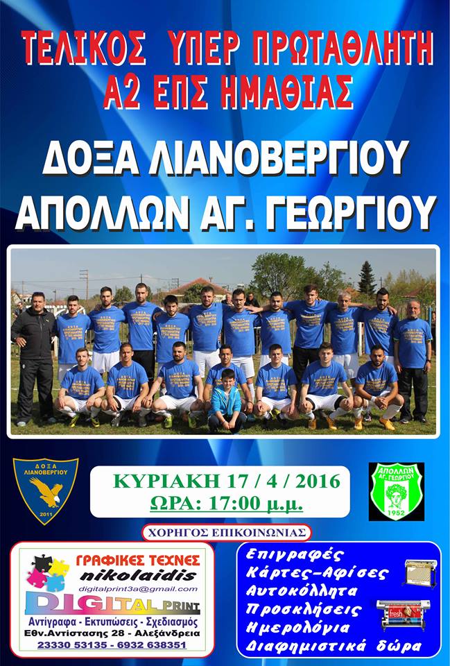 lianooΗ διοίκηση, ο προπονητής και οι ποδοσφαιριστές της Δόξας Λιανοβεργίου σας προσκαλούν στη γιορτή του ποδοσφαίρου για την ανάδειξη του υπερπρωταθλητή στην Α2 της ΕΠΣ Ημαθίας.