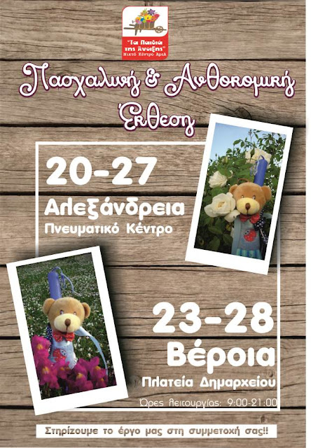 Η έκθεση της Βέροιας θα λειτουργεί στην πλατεία Δημαρχείου, από το Σάββατο 23 Απριλίου έως την Μ. Πέμπτη 28 Απριλίου από τις 09:00 το πρωί έως τις 09:00 το βράδυ. Στη Βέροια, μαζί με την Πασχαλινή έκθεση θα λειτουργήσει και η Ανθοκομική, με φυτά και λουλούδια εποχιακά, εσωτερικού και εξωτερικού χώρου και πρωτότυπες συνθέσεις, φιλοδοξώντας να γεμίσουν τη ζωή μας χρώμα και άρωμα. Επίσης, τις αγορές σας μπορείτε να τις κάνετε και από τον εκθεσιακό χώρο του κέντρου μας, καθημερινά από τις 09: 00 το πρωί έως τις 3:00 το μεσημέρι.