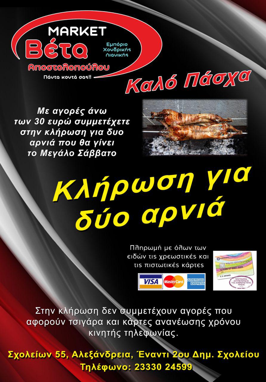 Για την περίοδο του Πάσχα με αγορές άνω των 30 ευρώ συμμετέχετε στην κλήρωση για δύο αρνιά που θα γίνει το Μεγάλο Σάββατο 30 Απριλίου!