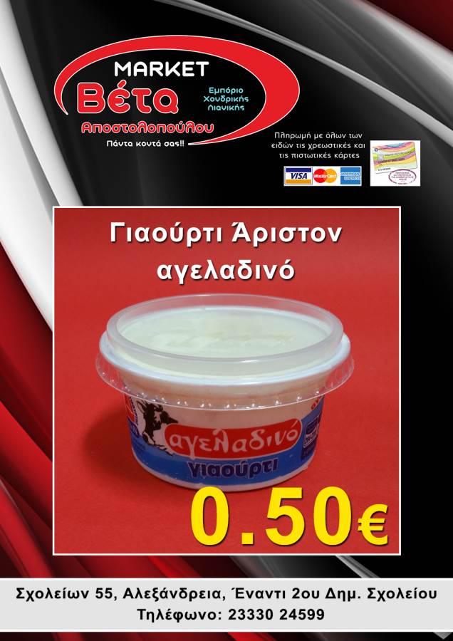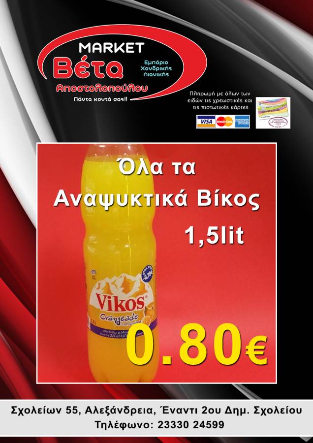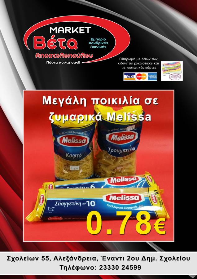 Το μάρκετ ΒΕΤΑ Αποστολοπούλου, βρίσκεται στην οδό Σχολείων 55 στην πόλη μας απέναντι από το 2ο Δημοτικό Σχολείο Αλεξάνδρειας.