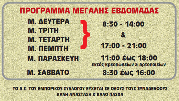 Ο Εμπορικός Σύλλογος Αλεξάνδρειας έχει φροντίσει ήδη να ανακοινώσει το πρόγραμμα λειτουργίας των καταστημάτων κατά τη διάρκεια της Μεγάλης Εβδομάδας.