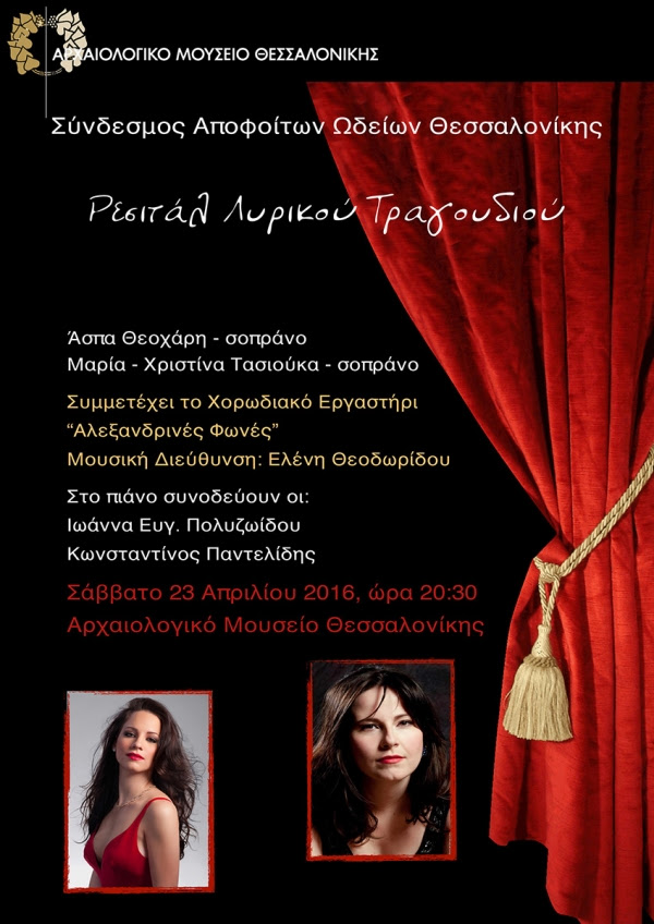 Σήμερα Σάββατο, 23 Απριλίου 2016 και ώρα 8.30μμ, οι Αλεξανδρινές Φωνές συμμετέχουν στο Ρεσιτάλ Λυρικού Τραγουδιού που θα πραγματοποιηθεί στο Αρχαιολογι