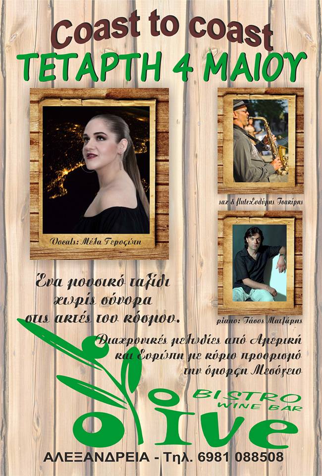 Σήμερα Τετάρτη 4 Μαΐου το OLIVE Bistro Wine Bar στον πεζόδρομο της Αλεξάνδρειας σας προσκαλεί σε ένα μουσικό ταξίδι χωρίς σύνορα στις ακτές του κόσμου.