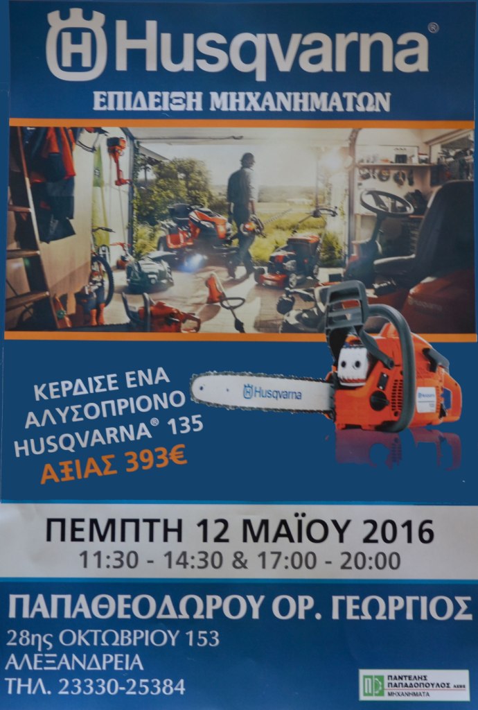 frΤην Πέμπτη 12 Μαϊου 2016 η Husqvarna σε συνεργασία με το επιλεγμένο κατάστημα ΠΑΠΑΘΕΟΔΩΡΟΥ , παρουσιάζει στην Αλεξάνδρεια όλη τη γκάμα των μηχανημάτων της, δίνοντας συμβουλές και λύνοντας απορίες τόσο στους επαγγελματίες όσο και στους ερασιτέχνες που αγαπούν την ενασχόληση με τον κήπο.