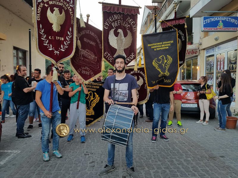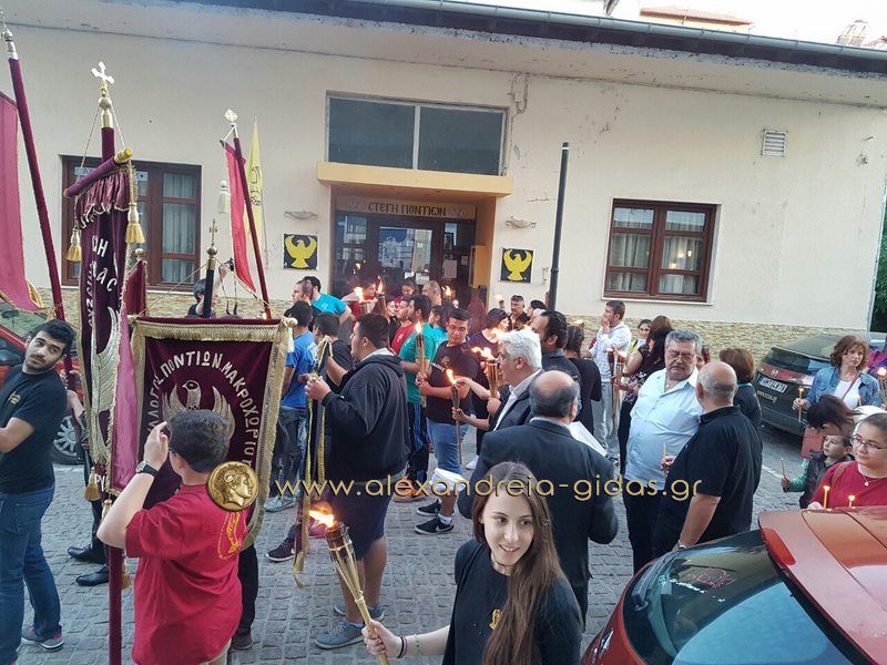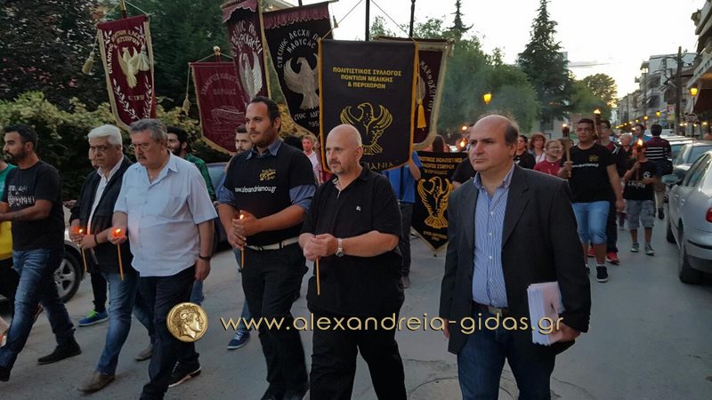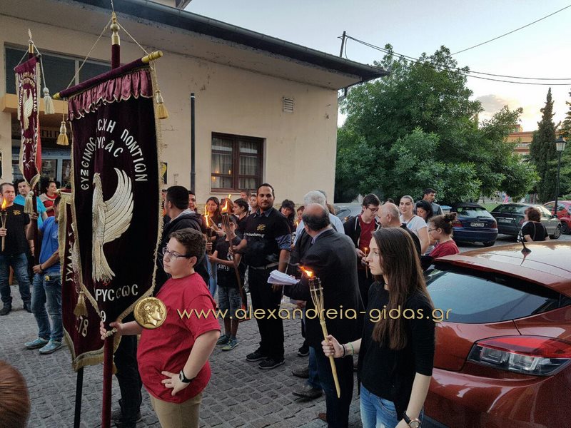Με αναμμένα κεριά, χορευτές και μέλη του Συλλόγου Ποντίων Αλεξάνδρειας και περιχώρων με καλεσμένα μέλη και χορευτές ποντιακών και μορφωτικών συλλόγων από τη Βέροια, τη Νάουσα, το Μακροχώρι και τον Σταυρό, με τη συνοδεία ποντιακής λύρας, πραγματοποίησαν το Σάββατο 14 Μαΐου λαμπαδηδρομία για να τιμήσουν τα θύματα της Γενοκτονίας των Ποντίων.