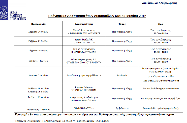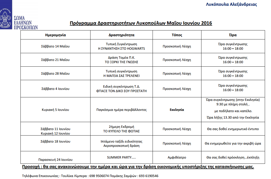 lykopoulaaa1-600x340-600x340-600x340Τα Λυκόπουλα Αλεξάνδρειας ανακοίνωσαν το πρόγραμμα δραστηριοτήτων τους για τους μήνες Μάιο – Ιούνιο 2016.