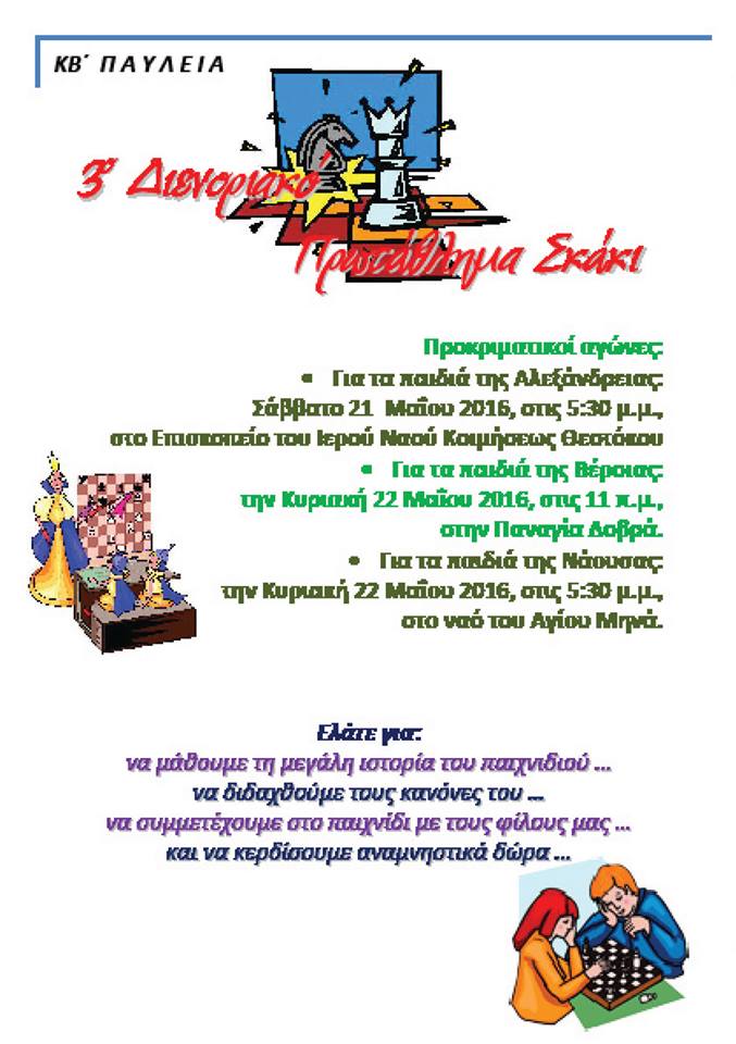 Οι προκριματικοί αγώνες ξεκινούν αύριο Σάββατο 21 Μαΐου για τα παιδιά της περιοχής της Αλεξάνδρειας, στις 5:30 μ.μ. στην αίθουσα του ιερού ναού Κοιμήσεως της Θεοτόκου (Παναγία).