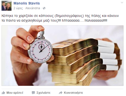 Στον προσωπικό του λογαριασμό στο Facebook ο αντιπρόεδρος της Κοινωφελούς Επιχείρησης του δήμου Αλεξάνδρειας Μανώλης Σταυρής άφησε ένα αινιγματικό σχόλιο που συζητιέται από το μεσημέρι στην πόλη.