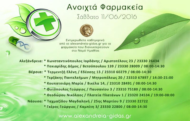 ΤΟΠΙΚΑ 11 Ιουνίου, 2016 posted by admin Share Ανοιχτά φαρμακεία Ημαθίας Σάββατο 11 Ιουνίου Αλεξάνδρεια: Αφήστε μια απάντηση Ακύρωση απάντησηςΗ ηλ. διεύθυνση σας δεν δημοσιεύεται. Τα υποχρεωτικά πεδία σημειώνονται με *Σχόλιο * Όνομα Email Ιστότοπος Αποθήκευσε το όνομά μου, email, και τον ιστότοπο μου σε αυτόν τον πλοηγό για την επόμενη φορά που θα σχολιάσω.