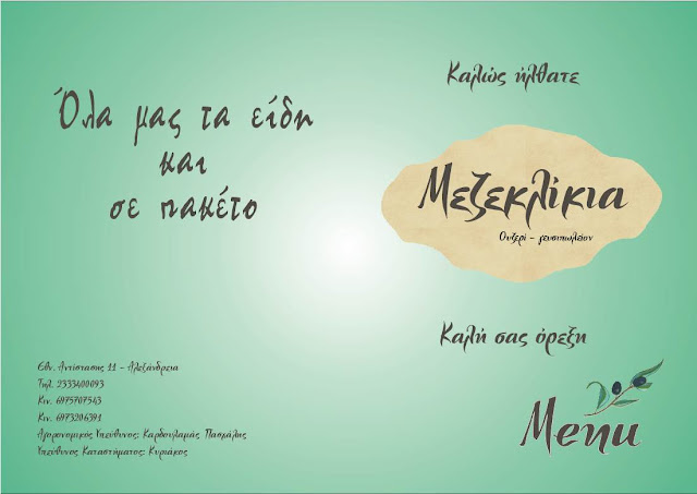 Όλα τα είδη που ετοιμάζει ο σεφ στα ΜΕΖΕΚΛΙΚΙΑ μπορείτε να τα παραγγείλετε και σε πακέτο στα τηλέφωνα 6983866239 και 2333400093!