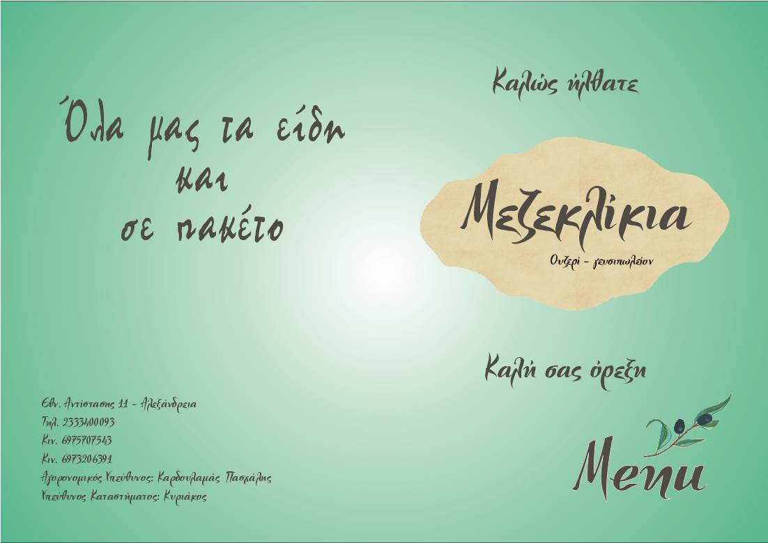 Τα ΜΕΖΕΚΛΙΚΙΑ στον πεζόδρομο της Αλεξάνδρειας ανανέωσαν την κουζίνα τους, πρόσθεσαν νέα πιάτα, προσάρμοσαν τις τιμές στις ανάγκες της εποχής μας, φρέσκαραν την αίθουσα με χρώματα και φωτισμό και σας υποδέχονται καθημερινά εκτός Δευτέρας στην όμορφη γωνία του πεζόδρομου της πόλης μας.