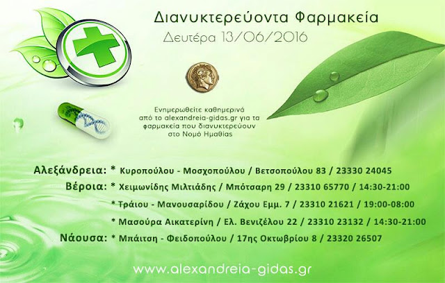 ΤΟΠΙΚΑ 13 Ιουνίου, 2016 posted by admin Share Εφημερεύοντα – διανυκτερεύοντα φαρμακεία Ημαθίας Δευτέρα 13 Ιουνίου Αλεξάνδρεια: Αφήστε μια απάντηση Ακύρωση απάντησηςΗ ηλ. διεύθυνση σας δεν δημοσιεύεται. Τα υποχρεωτικά πεδία σημειώνονται με *Σχόλιο * Όνομα Email Ιστότοπος Αποθήκευσε το όνομά μου, email, και τον ιστότοπο μου σε αυτόν τον πλοηγό για την επόμενη φορά που θα σχολιάσω.