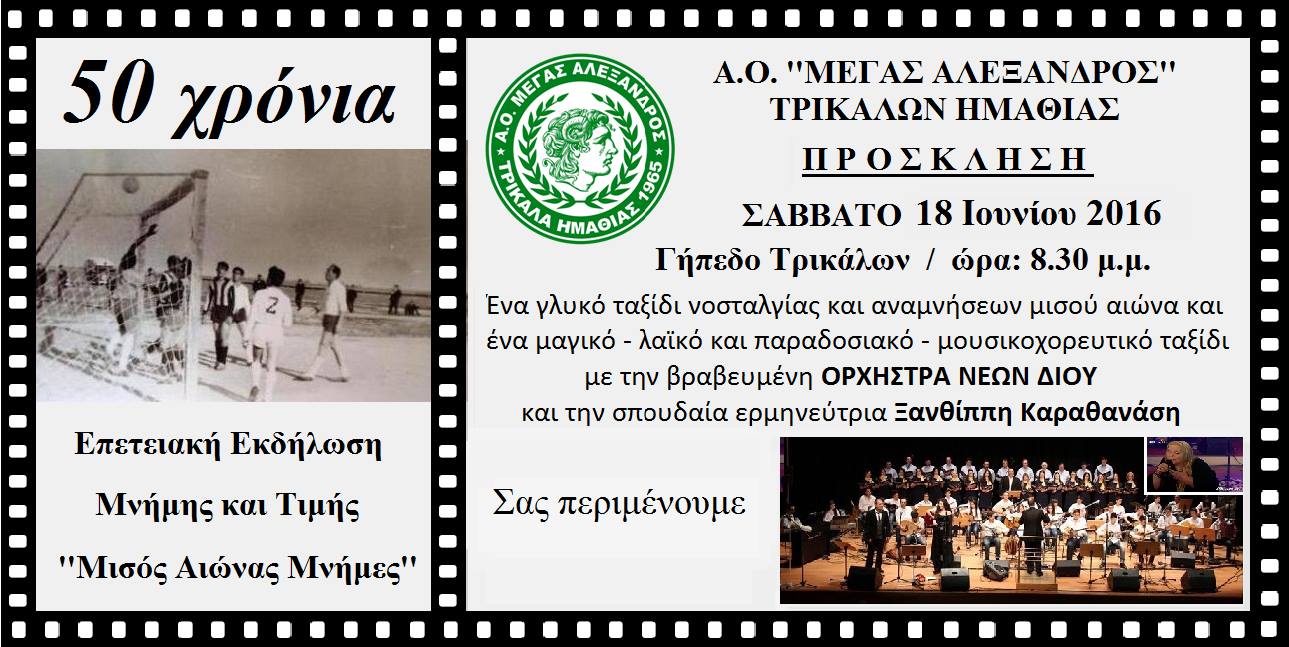 Ο Α.Ο. “Μέγας Αλέξανδρος” Τρικάλων Ημαθίας σας προσκαλεί σήμερα Σάββατο 18 Ιουνίου στις 20:30 στο γήπεδο Τρικάλων σε ένα γλυκό ταξίδι νοσταλγίας και αναμνήσεων μισού αιώνα και ένα μαγικό – λαϊκό και παραδοσιακό – μουσικοχορευτικό ταξίδι με την βραβευμένη ΟΡΧΗΣΤΡΑ ΝΕΩΝ ΔΙΟΥ και την σπουδαία ερμηνεύτρια Ξανθίππη Καραθανάση.