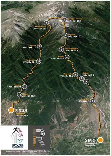 iopO Olympus Marathon είναι ένας σκληρός ορεινός μαραθώνιος 44 χιλιομέτρων ο οποίος έχει 3200 μέτρα θετική υψομετρική διαφορά αφού οι αθλητές ξεκινούν από σχεδόν μηδενικό υψόμετρο και φτάνουν στα 2780 μέτρα ύψος, περνώντας λίγο κάτω από την κορυφή του Ολύμπου και μπροστά από τον ‘θρόνο του Δία’ πριν τερματίσουν στο Λιτόχωρο. Ένας αγώνας – περιπέτεια που συνδυάζει μυθολογία, ιστορία και περνάει από μονοπάτια, αλπικό τοπίο, δίπλα από γκρεμούς και φαράγγια στο βουνό των Θεών.