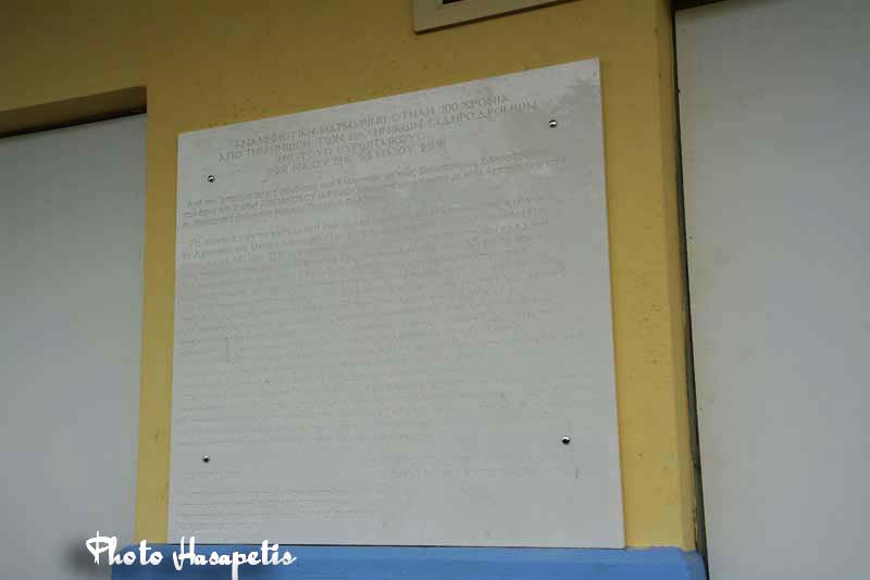 Σε ανάμνηση του μέγιστου αυτού ιστορικού γεγονότος τοποθετήθηκε μαρμάρινη στήλη στο κτίριο του Σιδηροδρομικού Σταθμού, η οποία φιλοτεχνήθηκε από τη γνωστή επιχείρηση επεξεργασίας Γρανιτών και Μαρμάρων του ΒΑΣΙΛΗ ΣΕΡΔΑΡΗ και προσφέρθηκε από κοινού με το Ίδρυμα ΠΑΣΧΑΛΗ και ΙΩΑΝΝΗ ΤΕΡΖΗ.