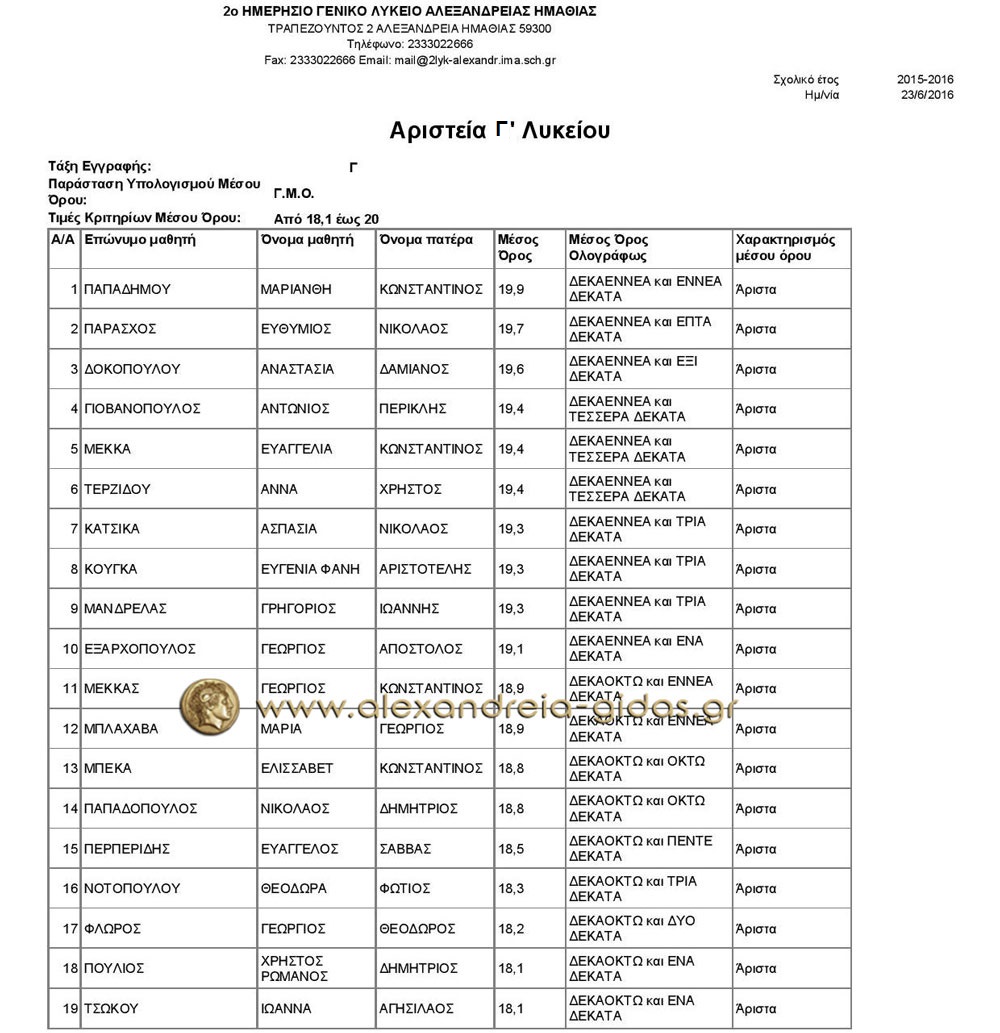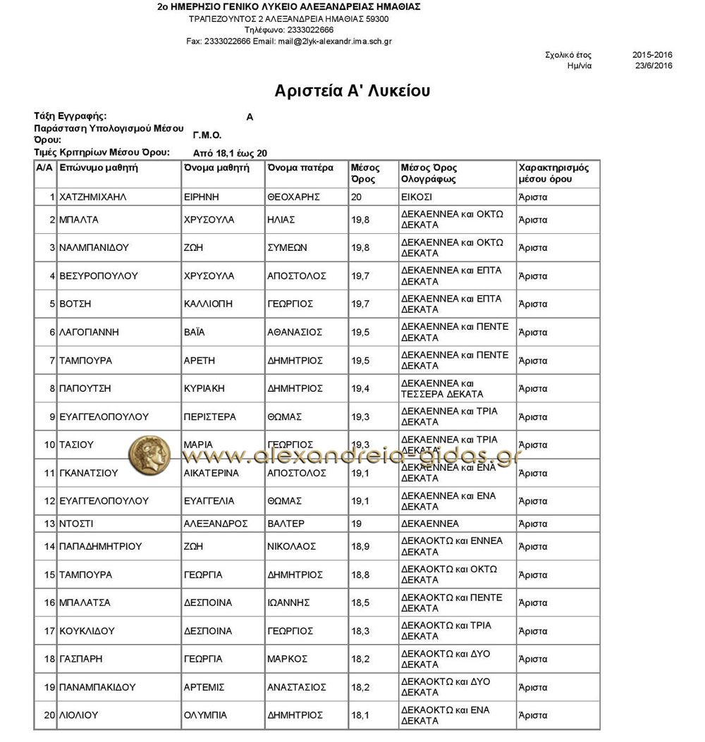 ΕΚΠΑΙΔΕΥΤΙΚΑ 23 Ιουνίου, 2016 posted by admin Share Τα αριστεία και τα βραβεία του 2ου Λυκείου Αλεξάνδρειας 2015-2016! Το 2ο ΓΕΛ Αλεξάνδρειας ανακοίνωσε τα ονόματα των μαθητών που αρίστευσαν και βραβεύτηκαν για το σχολικό έτος 2015-2016. Συγχαρητήρια σε όλους. Δείτε (κλικ στις εικόνες για μεγέθυνση): Αφήστε μια απάντηση Ακύρωση απάντησηςΗ ηλ. διεύθυνση σας δεν δημοσιεύεται. Τα υποχρεωτικά πεδία σημειώνονται με *Σχόλιο * Όνομα Email Ιστότοπος Αποθήκευσε το όνομά μου, email, και τον ιστότοπο μου σε αυτόν τον πλοηγό για την επόμενη φορά που θα σχολιάσω.