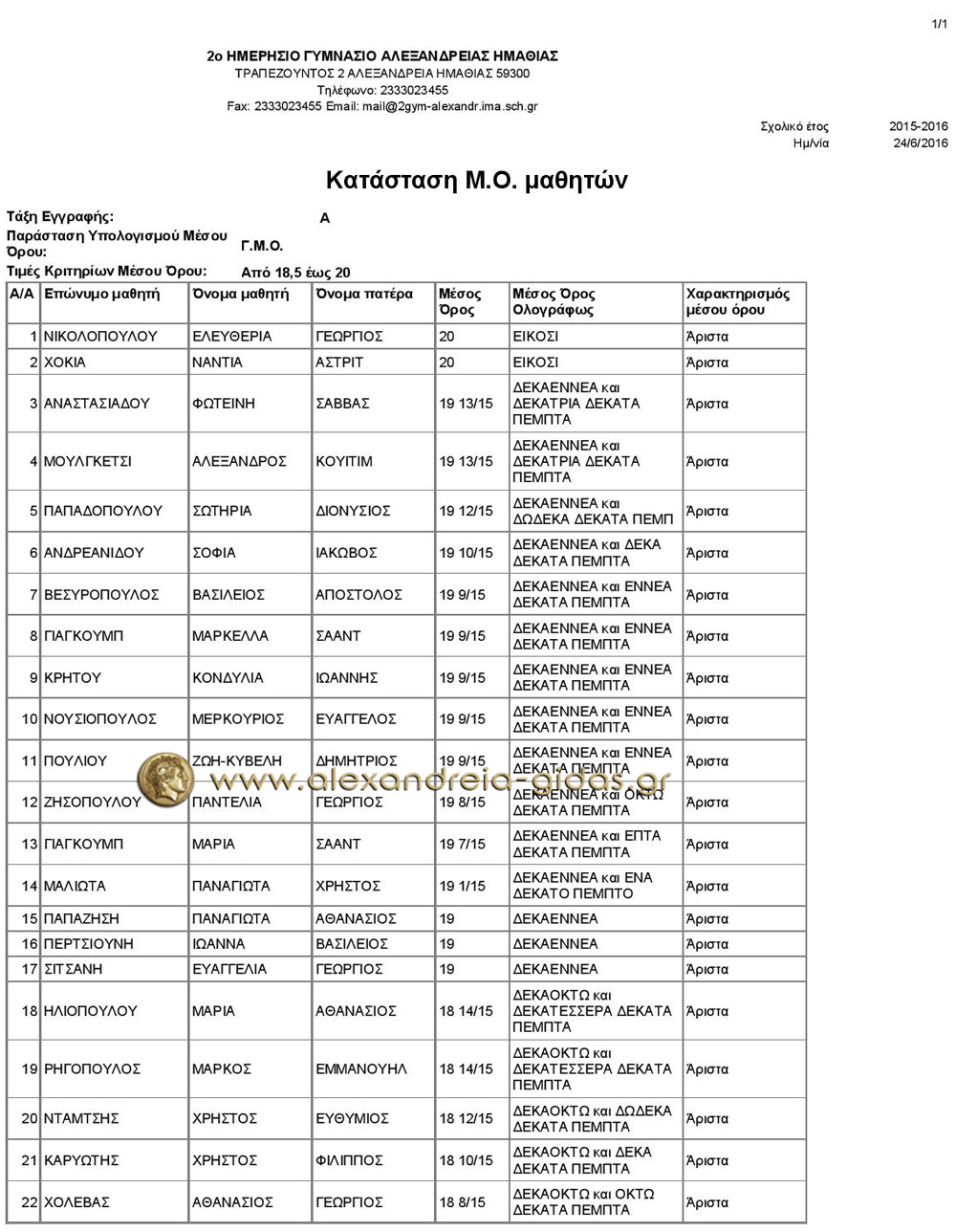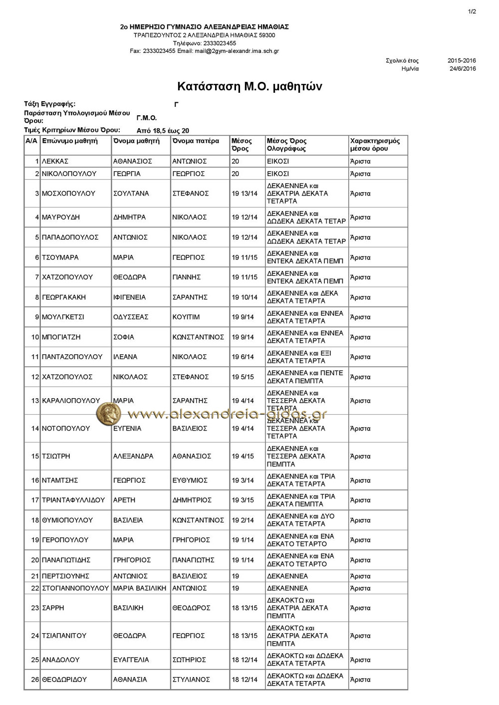 Το 2ο Γυμνάσιο Αλεξάνδρειας ανακοίνωσε τους πίνακες αριστείων των μαθητών και μαθητριών του σχολείου για το σχολικό έτος 2015-2016.