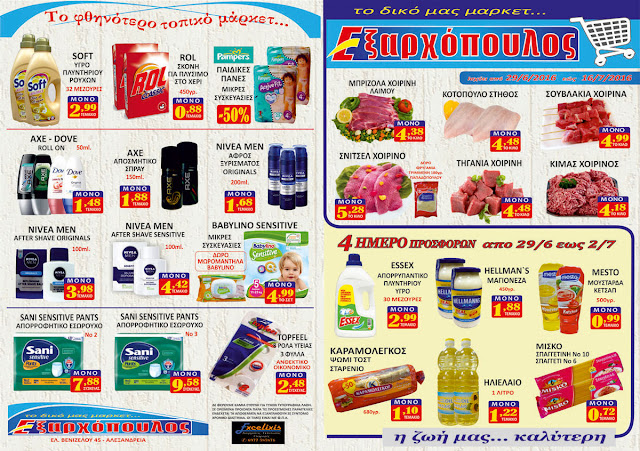 Τα τοπικά μας σούπερ μάρκετ ΕΞΑΡΧΟΠΟΥΛΟΣ ξεκινάει τις προσφορές του ολοκαίνουριου φυλλαδίου οι οποίες θα ισχύσουν από την Τετάρτη 29 Ιουνίου μέχρι το Σάββατο 16 Ιουλίου 2016.