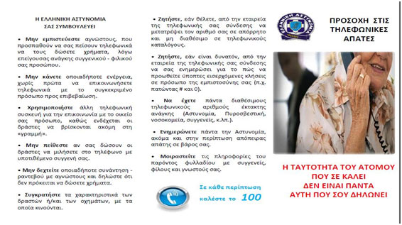 Η Ελληνική Αστυνομία στο πλαίσιο της πρόληψης και αποτροπής περιστατικών εξαπάτησης, από επιτήδειους που προσεγγίζουν κυρίως άτομα τρίτης ηλικίας με σκοπό την καταβολή χρημάτων, αναπτύσσει ενημερωτικές δράσεις και διανέμει έντυπο πληροφοριακό υλικό με χρήσιμες συμβουλές, σε πολίτες σε όλη τη χώρα.