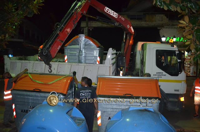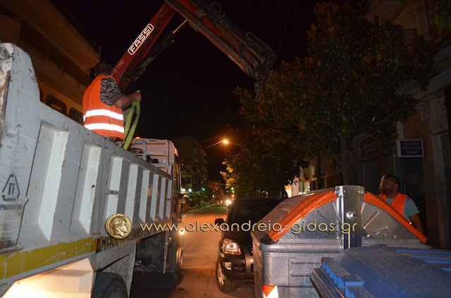 Μετά τα μεσάνυχτα συναντήσαμε τον αντιδήμαρχο καθαριότητας του δήμου Αλεξάνδρειας κ. Σωτήρη Τόκα με υπαλλήλους του δήμου στην πόλη μας.