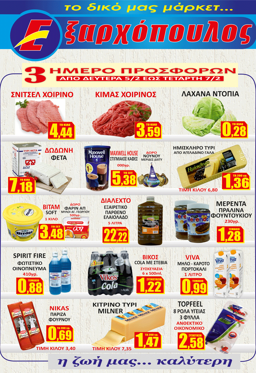 Το τοπικό σούπερ μάρκετ ΕΞΑΡΧΟΠΟΥΛΟΣ από τη Δευτέρα 5 Φεβρουαρίου μέχρι και την Τετάρτη 7 Φεβρουαρίου προσθέτει 15 νέα έκτακτα προϊόντα στις προσφορές του καταστήματος!