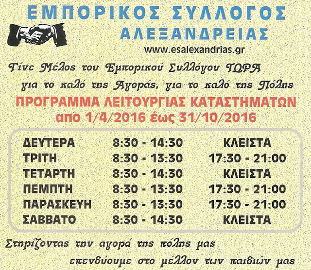 ΤΟΠΙΚΑ 7 Ιουλίου, 2016 posted by admin Share Το καλοκαιρινό ωράριο των εμπορικών καταστημάτων της Αλεξάνδρειας Ο Εμπορικός Σύλλογος Αλεξάνδρειας ανακοινώνει ότι το ωράριο λειτουργίας καταστημάτων κατά τους θερινούς μήνες, θα παραμείνει ως έχει. Δείτε: Αφήστε μια απάντηση Ακύρωση απάντησηςΗ ηλ. διεύθυνση σας δεν δημοσιεύεται. Τα υποχρεωτικά πεδία σημειώνονται με *Σχόλιο * Όνομα Email Ιστότοπος Αποθήκευσε το όνομά μου, email, και τον ιστότοπο μου σε αυτόν τον πλοηγό για την επόμενη φορά που θα σχολιάσω.