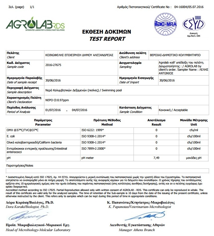Τα αποτελέσματα από την ανάλυση του νερού της πισίνας του κολυμβητηρίου που πραγματοποιήθηκε  από το εργαστήριο μικροβιολογίας της πιστοποιημένης εταιρίας AGROLAB έδειξαν ότι οι κολυμβητικές