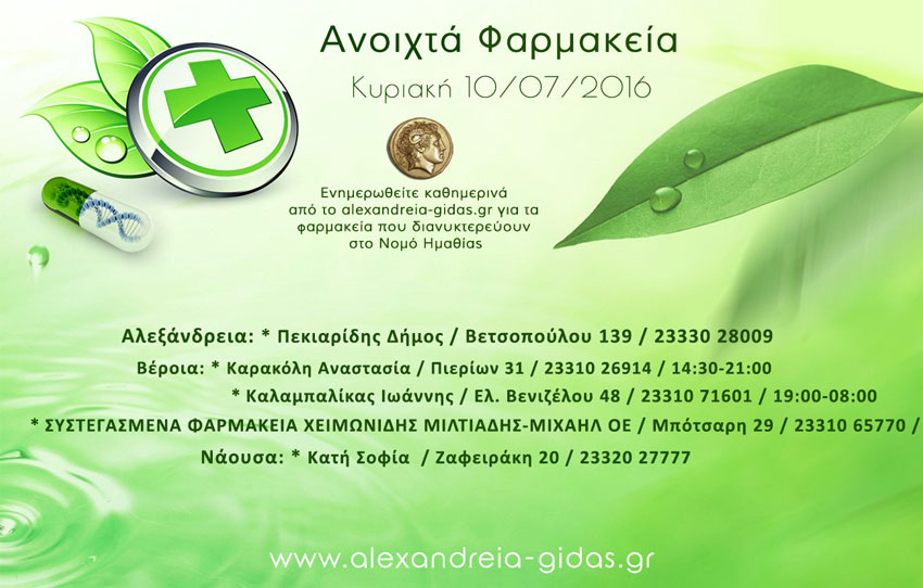ΤΟΠΙΚΑ 10 Ιουλίου, 2016 posted by admin Share Ανοιχτά φαρμακεία Ημαθίας Κυριακή 10 Ιουλίου Αλεξάνδρεια: Αφήστε μια απάντηση Ακύρωση απάντησηςΗ ηλ. διεύθυνση σας δεν δημοσιεύεται. Τα υποχρεωτικά πεδία σημειώνονται με *Σχόλιο * Όνομα Email Ιστότοπος Αποθήκευσε το όνομά μου, email, και τον ιστότοπο μου σε αυτόν τον πλοηγό για την επόμενη φορά που θα σχολιάσω.