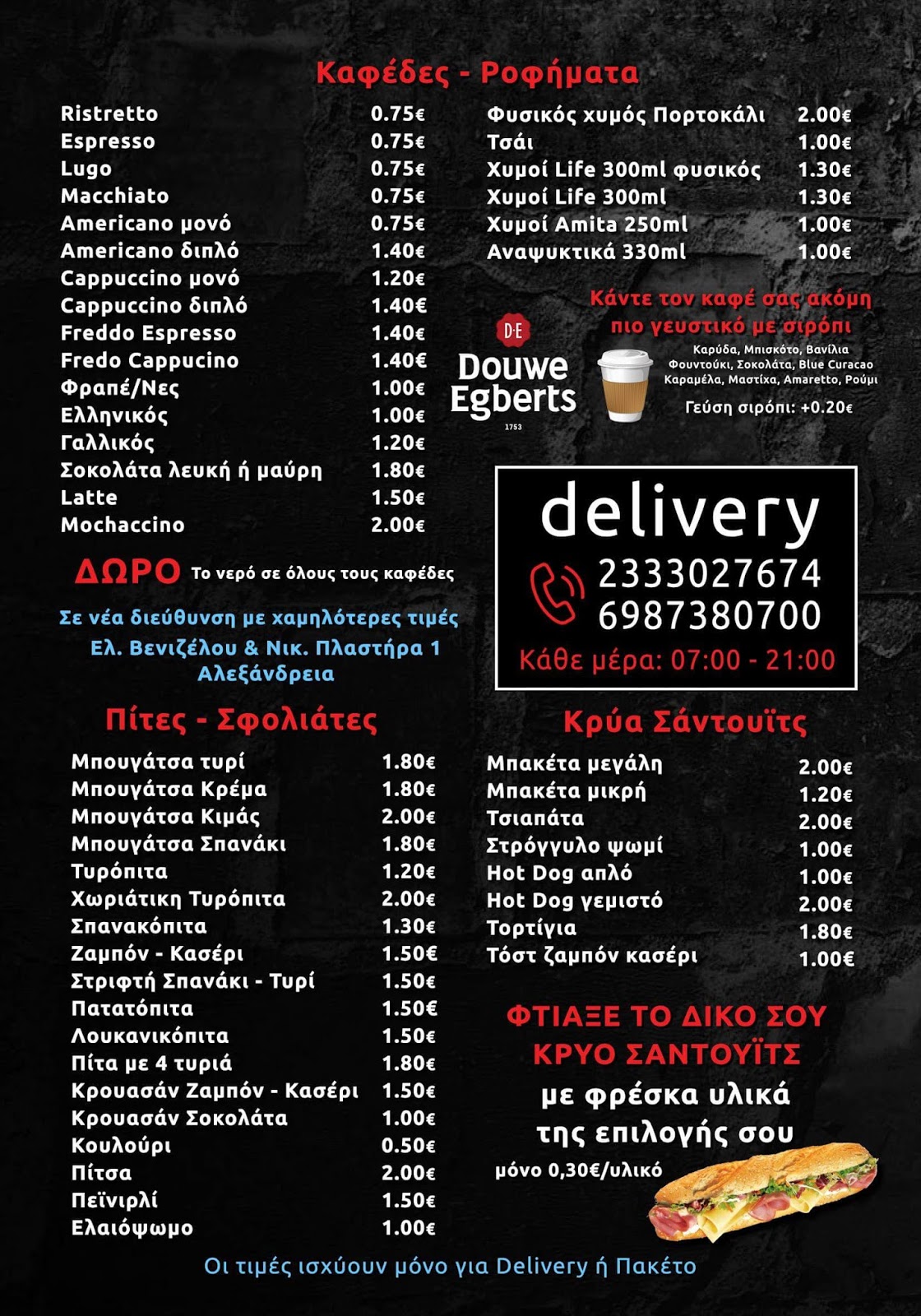 Το καφέ – μπουγάτσα «PARADA» βρίσκεται στη γωνία της Ελ. Βενιζέλου με τη Ν. Πλαστήρα (στροφή για το ΚΤΕΛ Αλεξάνδρειας) και σας υποδέχεται καθημερινά από νωρίς το πρωί μέχρι αργά το βράδυ.