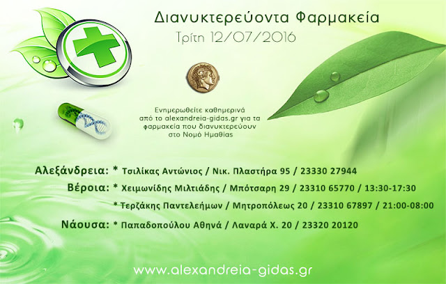 ΤΟΠΙΚΑ 12 Ιουλίου, 2016 posted by admin Share Εφημερεύοντα – διανυκτερεύοντα φαρμακεία Ημαθίας Τρίτη 12 Ιουλίου Αλεξάνδρεια: Αφήστε μια απάντηση Ακύρωση απάντησηςΗ ηλ. διεύθυνση σας δεν δημοσιεύεται. Τα υποχρεωτικά πεδία σημειώνονται με *Σχόλιο * Όνομα Email Ιστότοπος Αποθήκευσε το όνομά μου, email, και τον ιστότοπο μου σε αυτόν τον πλοηγό για την επόμενη φορά που θα σχολιάσω.