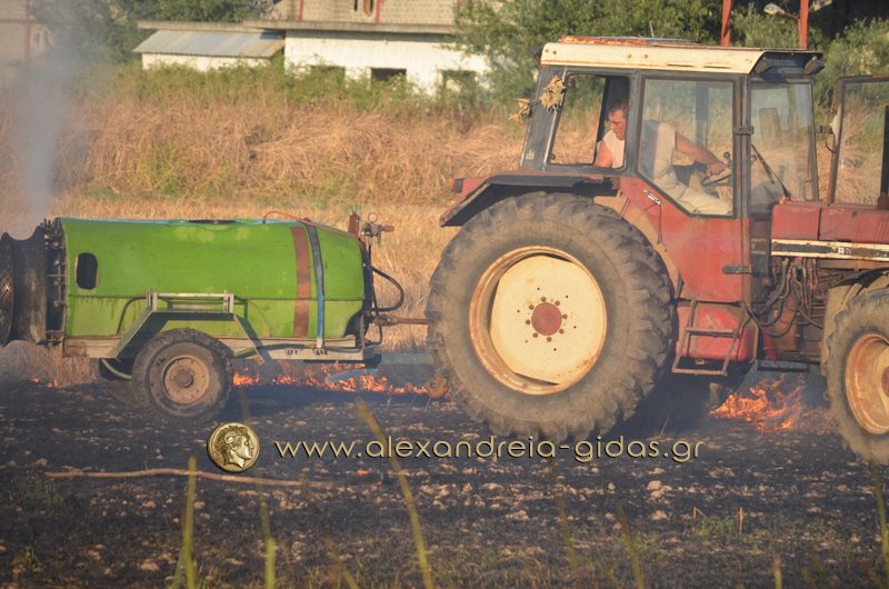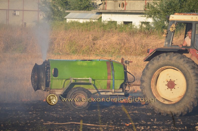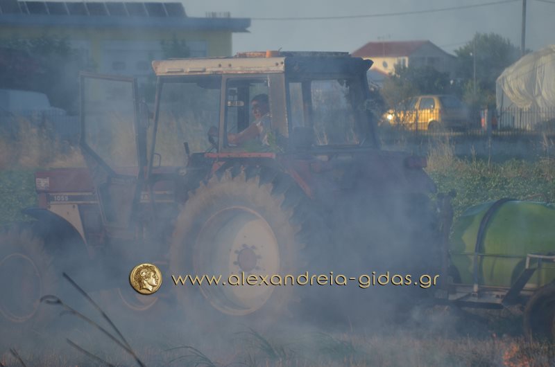 Στο σημείο βρισκόταν πριν την πυροσβεστική ο πρώην αντιδήμαρχος Αλεξάνδρειας Σάκης Κούγκας ο οποίος με το τρακτέρ του και το ραντιστικό του το οποίο γέμισε με νερό, βοήθησε αποτελεσματικά στο σβήσιμο της φωτιάς όπως θα δείτε στο παρακάτω βίντεο και τις εικόνες: