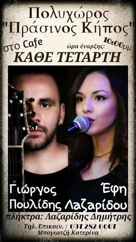 Κάθε Τετάρτη λοιπόν ο Γιώργος Πουλίδης και η Έφη Λαζαρίδου θα μας κρατάνε συντροφιά με καλό έντεχνο ελληνικό τραγούδι στο καφέ του ΠΡΑΣΙΝΟΥ ΚΗΠΟΥ.