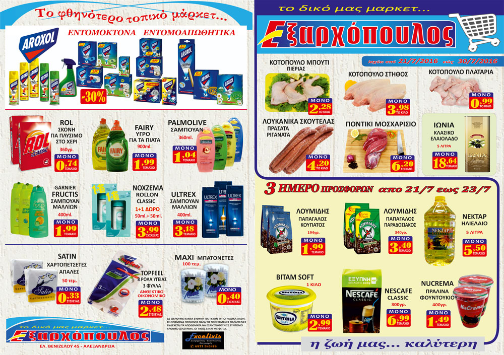 Τα τοπικά μας σούπερ μάρκετ ΕΞΑΡΧΟΠΟΥΛΟΣ ξεκινάει τις προσφορές του ολοκαίνουριου φυλλαδίου οι οποίες θα ισχύσουν από την Τετάρτη 21 Ιουλίου μέχρι το Σάββατο 30 Ιουλίου 2016.