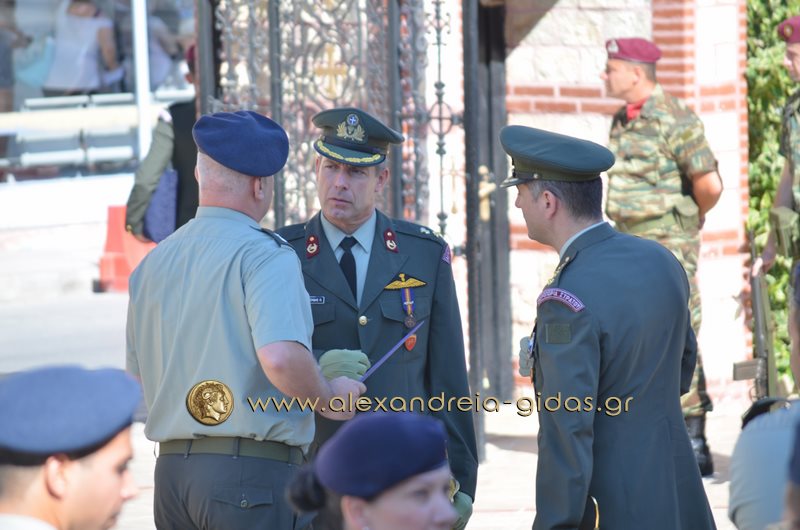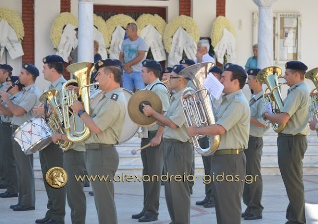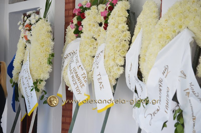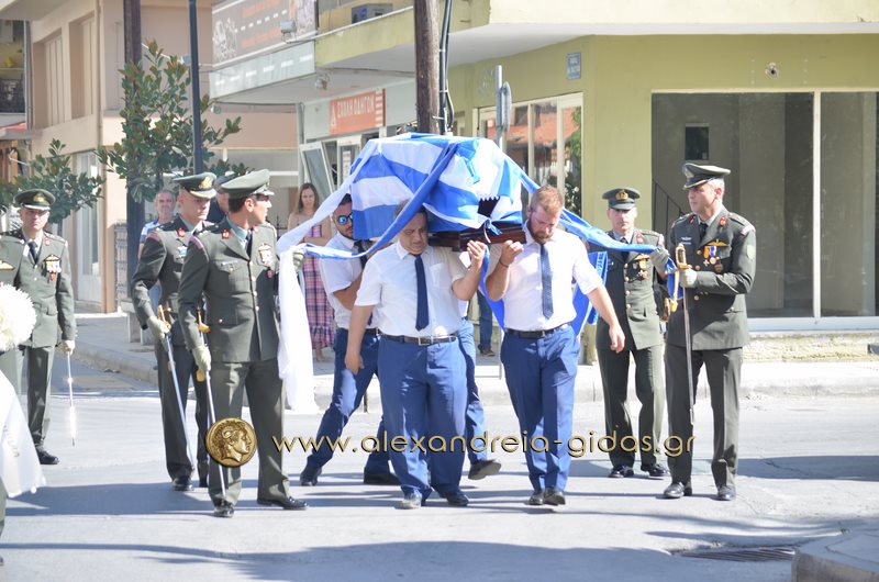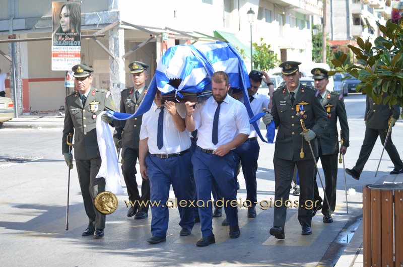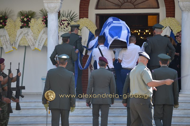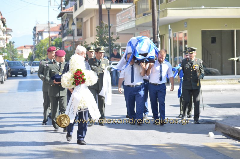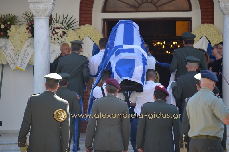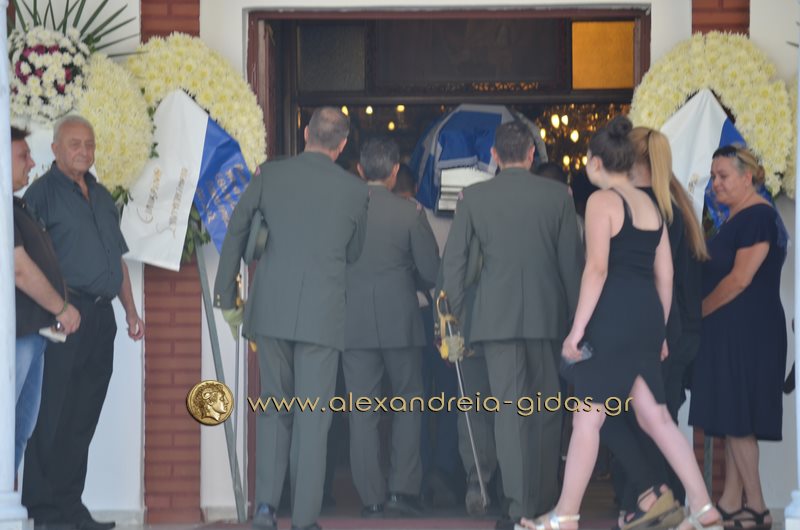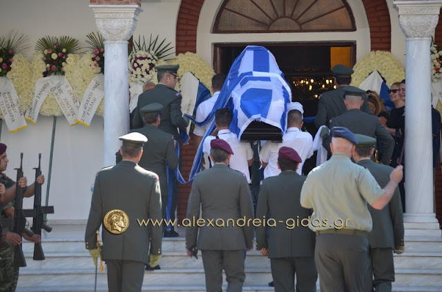 Το φέρετρο με τη σωρό του σκεπασμένο με τη γαλανόλευκη έφτασε στην Παναγία Αλεξάνδρειας λίγο μετά τις 10 το πρωί και άγημα του στρατού απένειμε τιμές στον πρόωρα χαμένο Αντιστράτηγο.