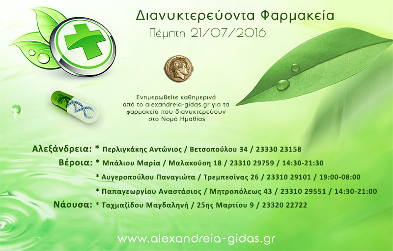 ΤΟΠΙΚΑ 21 Ιουλίου, 2016 posted by admin Share Εφημερεύοντα – διανυκτερεύοντα φαρμακεία Ημαθίας Πέμπτη 21 Ιουλίου Αλεξάνδρεια: Αφήστε μια απάντηση Ακύρωση απάντησηςΗ ηλ. διεύθυνση σας δεν δημοσιεύεται. Τα υποχρεωτικά πεδία σημειώνονται με *Σχόλιο * Όνομα Email Ιστότοπος Αποθήκευσε το όνομά μου, email, και τον ιστότοπο μου σε αυτόν τον πλοηγό για την επόμενη φορά που θα σχολιάσω.