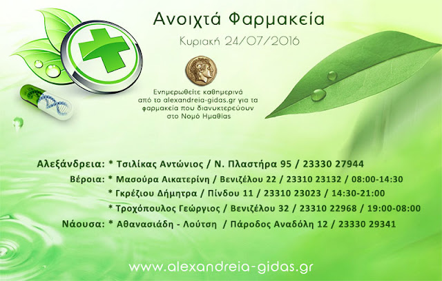 ΤΟΠΙΚΑ 24 Ιουλίου, 2016 posted by admin Share Ανοιχτά φαρμακεία Ημαθίας Κυριακή 24 Ιουλίου Αλεξάνδρεια: Αφήστε μια απάντηση Ακύρωση απάντησηςΗ ηλ. διεύθυνση σας δεν δημοσιεύεται. Τα υποχρεωτικά πεδία σημειώνονται με *Σχόλιο * Όνομα Email Ιστότοπος Αποθήκευσε το όνομά μου, email, και τον ιστότοπο μου σε αυτόν τον πλοηγό για την επόμενη φορά που θα σχολιάσω.
