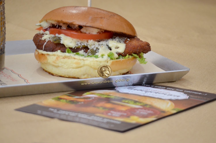 Σνίτσελ κοτόπουλο, brioche (ψωμάκι), μαρούλι, πίκλες, ντομάτα, τριμμένο κεφαλοτύρι, παρμεζάνα sauce.