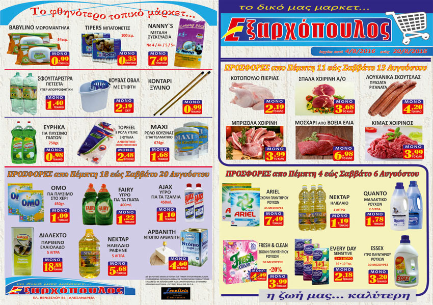 Τα τοπικά μας σούπερ μάρκετ ΕΞΑΡΧΟΠΟΥΛΟΣ ξεκίνησε τις προσφορές του ολοκαίνουριου φυλλαδίου οι οποίες μέχρι το Σάββατο 20 Αυγούστου 2016.