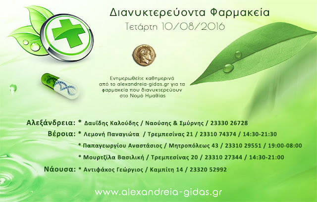 ΤΟΠΙΚΑ 10 Αυγούστου, 2016 posted by admin Share Εφημερεύοντα – διανυκτερεύοντα φαρμακεία Ημαθίας Τετάρτη 10 Αυγούστου Αλεξάνδρεια: Αφήστε μια απάντηση Ακύρωση απάντησηςΗ ηλ. διεύθυνση σας δεν δημοσιεύεται. Τα υποχρεωτικά πεδία σημειώνονται με *Σχόλιο * Όνομα Email Ιστότοπος Αποθήκευσε το όνομά μου, email, και τον ιστότοπο μου σε αυτόν τον πλοηγό για την επόμενη φορά που θα σχολιάσω.