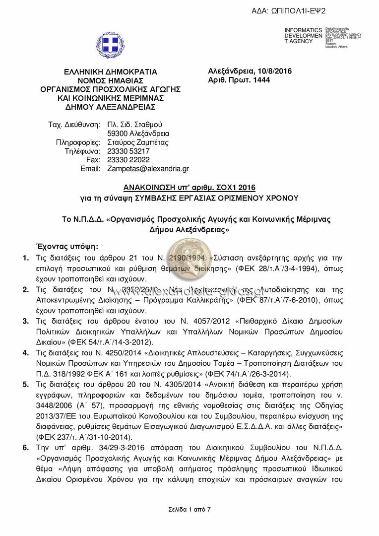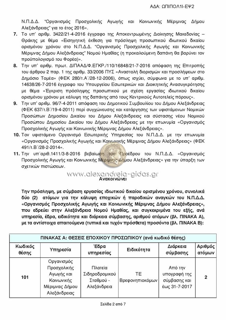 Την πρόσληψη, με σύμβαση εργασίας ιδιωτικού δικαίου ορισμένου χρόνου, συνολικά δύο (2) ατόμων για την κάλυψη εποχικών ή παροδικών αναγκών του Ν.Π.Δ.Δ. «Οργανισμός Προσχολικής Αγωγής και Κοινωνικής Μέριμνας Δήμου Αλεξάνδρειας», που εδρεύει στην Αλεξάνδρεια Νομού Ημαθίας.