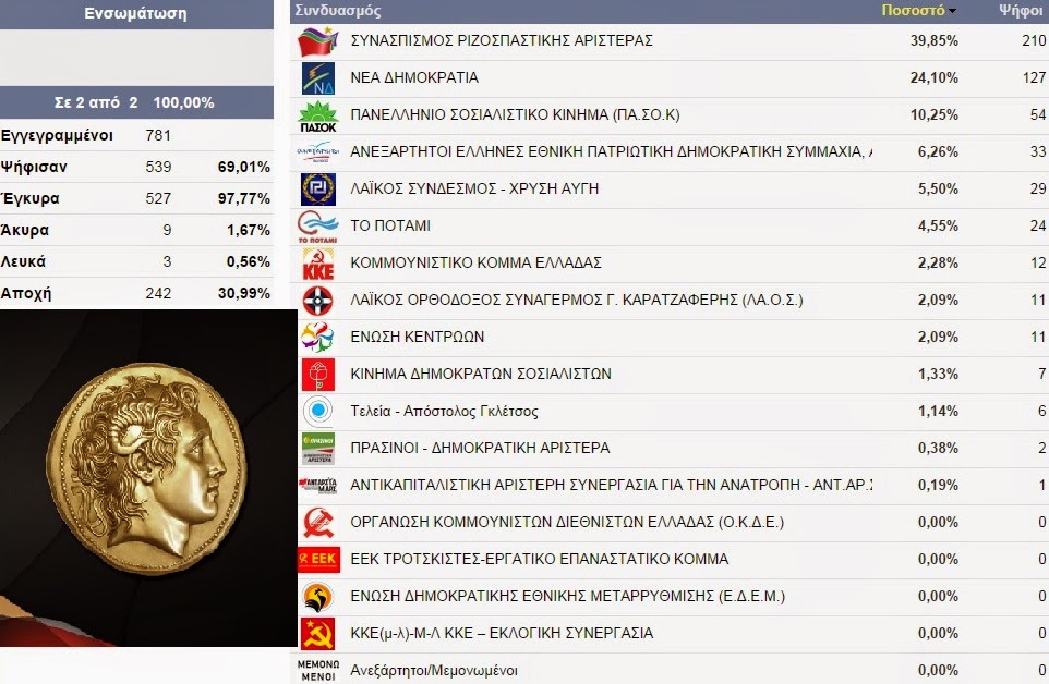 ΠΟΛΙΤΙΚΗ 27 Ιανουαρίου, 2015 posted by admin Share Το εκλογικό αποτέλεσμα στο Βρυσάκι (εκλογικά τμήματα 21-22) Με ποσοστό 39,85 επικράτησε ο ΣΥΡΙΖΑ στα δύο εκλογικά τμήματα του Βρυσακίου. Δείτε τα τελικά αποτελέσματα: Αφήστε μια απάντηση Ακύρωση απάντησηςΗ ηλ. διεύθυνση σας δεν δημοσιεύεται. Τα υποχρεωτικά πεδία σημειώνονται με *Σχόλιο * Όνομα Email Ιστότοπος Αποθήκευσε το όνομά μου, email, και τον ιστότοπο μου σε αυτόν τον πλοηγό για την επόμενη φορά που θα σχολιάσω.