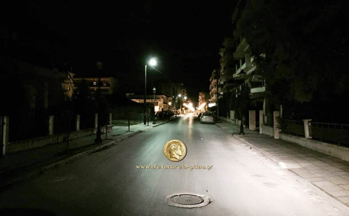 Δύο φωτογραφικά στιγμιότυπα σας παρουσιάζουμε παρακάτω. Το πρώτο είναι το βράδυ της Δευτέρας μετά τις 22:30 από τις αρχές της οδού Νικολάου Πλαστήρα στην Αλεξάνδρεια όπου τα νέα φώτα της ανάπλασης είναι σβηστά για άγνωστους λόγους.