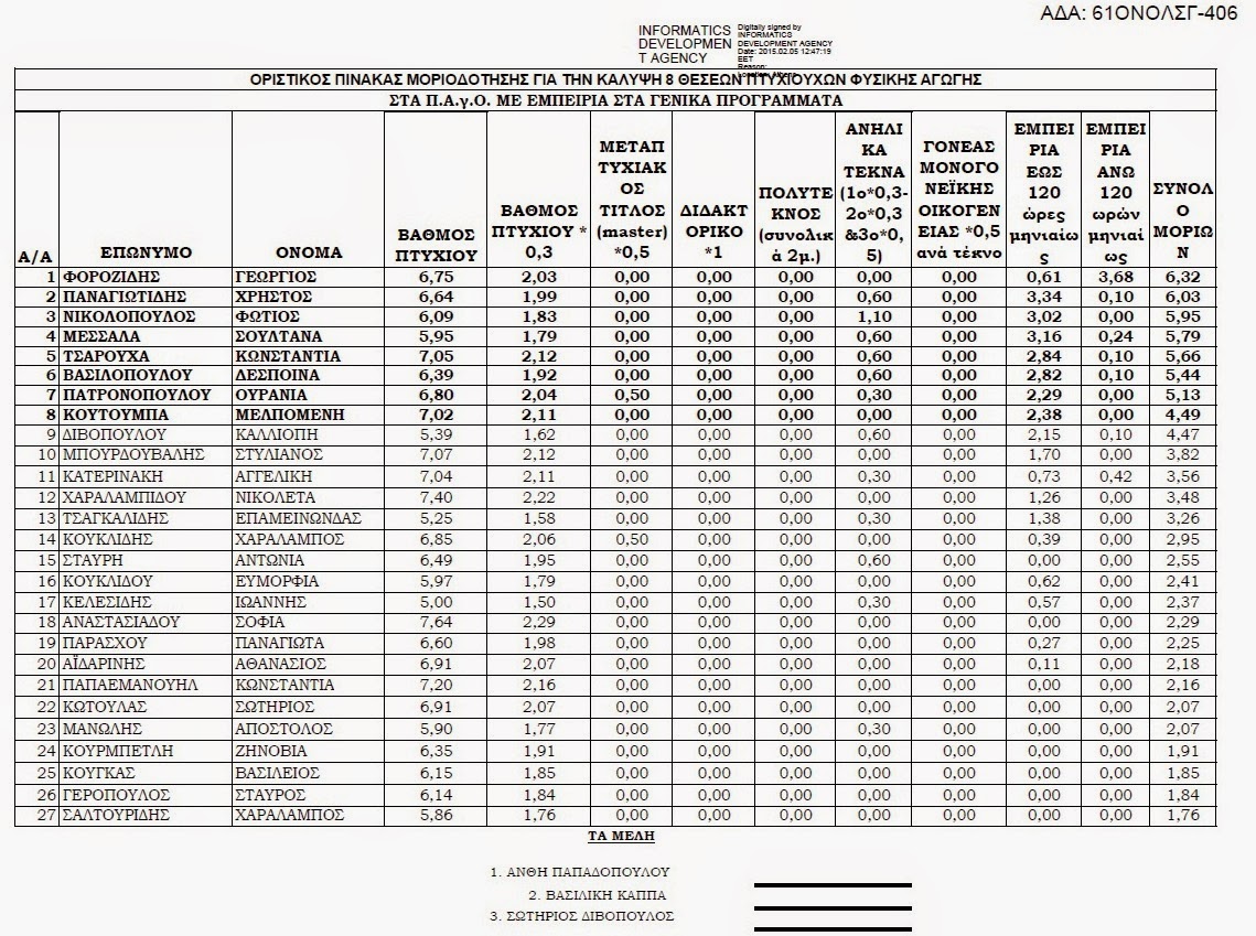ΟΡΙΣΤΙΚΟΣ ΠΙΝΑΚΑΣ ΚΑΤΑΤΑΞΗΣ ΜΕ ΕΙΔΙΚΗ ΑΓΩΓΗ: