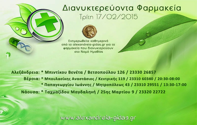 ΤΟΠΙΚΑ 17 Φεβρουαρίου, 2015 posted by admin Share Εφημερεύοντα – διανυκτερεύοντα φαρμακεία Ημαθίας Τρίτη 17/02 Αλεξάνδρεια: Αφήστε μια απάντηση Ακύρωση απάντησηςΗ ηλ. διεύθυνση σας δεν δημοσιεύεται. Τα υποχρεωτικά πεδία σημειώνονται με *Σχόλιο * Όνομα Email Ιστότοπος Αποθήκευσε το όνομά μου, email, και τον ιστότοπο μου σε αυτόν τον πλοηγό για την επόμενη φορά που θα σχολιάσω.